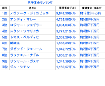 錦織6位 騒動トミック19位 - テニス365 | tennis365.net 男子テニスの27日付 今季獲得賞金ランキングが発表され、世界ランク5位の錦織圭(日本)は1,988,656ドル(約2億4千万円)で前回と変わらず6位、トップ10で ...