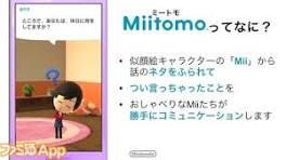 【速報】任天堂初のスマホアプリ『Miitomo(ミートモ)』は3月中旬配信! 事前登録は2月17日からスタート 【速報】任天堂初のスマホアプリ『Miitomo(ミートモ)』は3月中旬配信! 事前登録は2月17日からスタート. 2016-02-03 14:30 投稿 ...