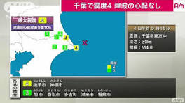 【速報】茨城県南部、千葉県北東部で震度4 午前0時15分ごろに茨城県南部、千葉県北東部で震度4の地震がありました。 震源地は千葉県東方沖で、地震の規模(マグニチュード)は4.6と推定されます。