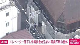 【速報】「人が下敷きに」エレベーター落下し作業員が意識不明[2022/05/06 16:55] - テレ朝news 東京・台東区の工事現場でエレベーターが落下する事故がありました。50代くらいの男性が巻き込まれ、意識不明の重体です。 6日午後4時ごろ、台東区寿の工事 ...