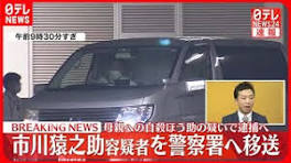 【速報】市川猿之助容疑者を警察署へ移送 母親への自殺ほう助の疑いで逮捕へ - YouTube 歌舞伎俳優の市川猿之助容疑者について、警視庁が母親に対する自殺ほう助の疑いで逮捕状を取ったことが捜査関係者への取材でわかりました。