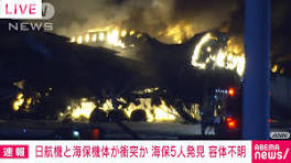 【速報】海保5人発見も容体不明 日航機と海保機体が衝突か 物資輸送で新潟向かう予定 - テレ朝news 羽田空港のC滑走路に着陸した日本航空の機体と海上保安庁の航空機が衝突して炎上しました。ポンプ車など63台が出動して消火活動が続けられています。