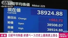 【速報】日経平均 一時終値の史上最高値(3万8915円)上回る バブル期1989年以来(2024年2月22日) 日経平均株価が一時、600円以上上昇し、バブル期につけた終値ベースの史上最高値を上回りました。 日経平均は、1989年12月29日につけた終値での最高値3 ...