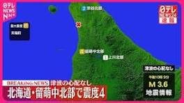 【速報】北海道・天塩町で震度4 津波の心配なし - YouTube 気象庁によると、24日午後10時9分ごろ、地震があった。震源地は留萌中北部。震源の深さは10キロ。地震の規模を示すマグニチュードは3.6と推定。