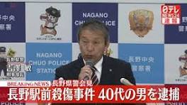 【速報】長野駅前殺傷事件、46歳の男を逮捕 長野県警が会見 - YouTube 今月22日、JR長野駅前で男女3人が男に刃物で刺され、1人が死亡、2人が重軽傷を負った事件で、長野県警は26日、殺人未遂の疑いで40代の男を逮捕しました。