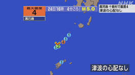 | 緊急地震速報=Jアラート情報(24日16時4分) - 沖縄タイムス+プラス 総務省消防庁の全国瞬時警報システム(Jアラート)が24日午後4時4分ごろ、予想最大震度5弱(予想最大長周期地震動階級1未満)の緊急地震速報を出した。