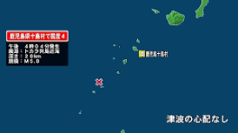 鹿児島県十島村で震度4 津波の心配なし(24日16:04) - NHKニュース ... 速報を発表しましたが、震度5弱以上の強い揺れは観測されませんでした。 気象庁は、「緊急地震速報は地震直後のわずかな時間で揺れを予測するため、震度で1 ...