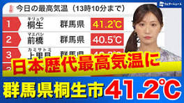 【速報】群馬県桐生市で日本歴代最高の41.2℃に - YouTube 5日(火)13時10分時点で、群馬県桐生市で最高気温が41.2℃まで上昇。 先週30日(水)午後に兵庫県丹波市・柏原で観測された日本歴代最高記録に並びました。