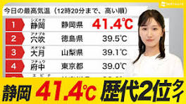【速報】静岡で41.4℃観測 日本歴代2位に並ぶ危険な暑さ - YouTube 静岡では41.4℃観測しました。日本歴代2位に並ぶ高温で、このあと観測史上最高気温を更新する可能性があります。 こまめな水分補給や塩分補給、エアコンの ...