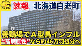 【速報】北海道・胆振の白老町でA型鳥インフル "高病原性"なら約46万羽処分へ 速報です。 胆振の白老町の養鶏場で、死んだニワトリが高病原性鳥インフルエンザに感染した疑いがあることが分かりました。 北海道によりますと、白老町の ...